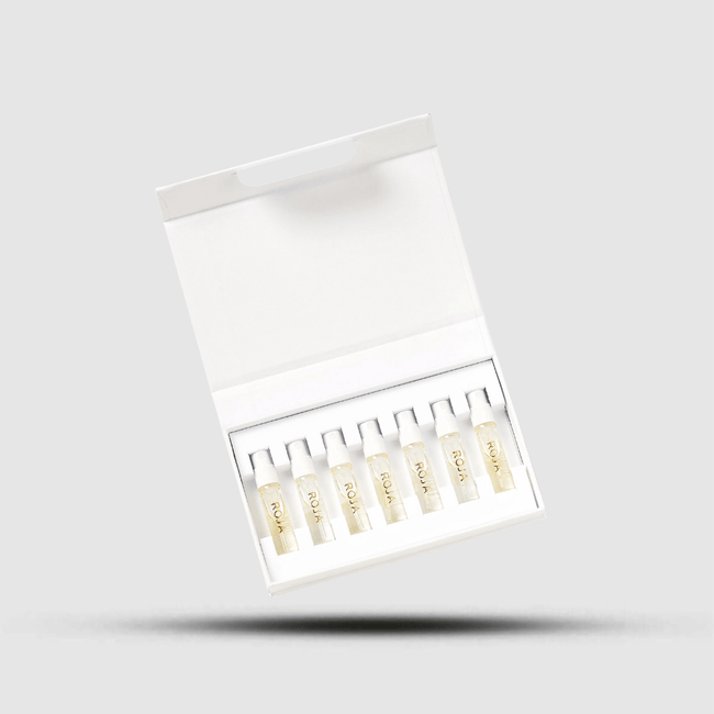 A beautifully curated discovery library tailored for feminine fragrance exploration. This set includes seven distinct Roja creations, each in a 2 ml format — ideal for testing, gifting, or travel.