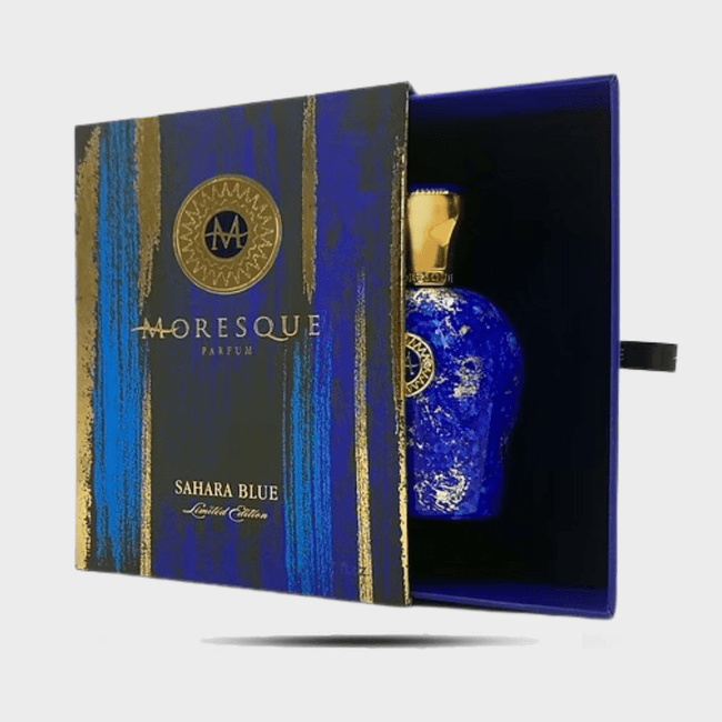Sahara Blue by Moresque is a vibrant and adventurous fragrance that combines zesty citrus, fresh spices, and aquatic undertones. Bright notes of lemon, ginger, and green apple open the composition, balanced by aromatic lavender and jasmine. The base settles into a marine-woody accord of seaweed, oakmoss, and amber, softened by white musk for a refined finish.