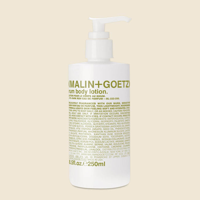 The Rum Body Lotion by Malin + Goetz is a hydrating and aromatic lotion designed to nourish and soften the skin. This lightweight formula features a warm and inviting rum scent, blended with essential fatty acids to provide long-lasting moisture without feeling greasy.   Key Ingredients and Product Features:- Rum Extract: Provides a warm and comforting scent. - Essential Fatty Acids: Hydrate and nourish the skin, leaving it feeling soft and smooth.    - Vitamin B5: Helps to soothe and moisturize the skin.    Product Details:- Size: 250ml - Made in: USA - Fragrance Family: Warm, Spicy, Gourmand. Who It's For:The Rum Body Lotion is suitable for all skin types. It's ideal for those who appreciate a warm and inviting scent and want a hydrating body lotion that leaves the skin feeling soft and smooth. This lotion is perfect for daily use and can be applied to the entire body.